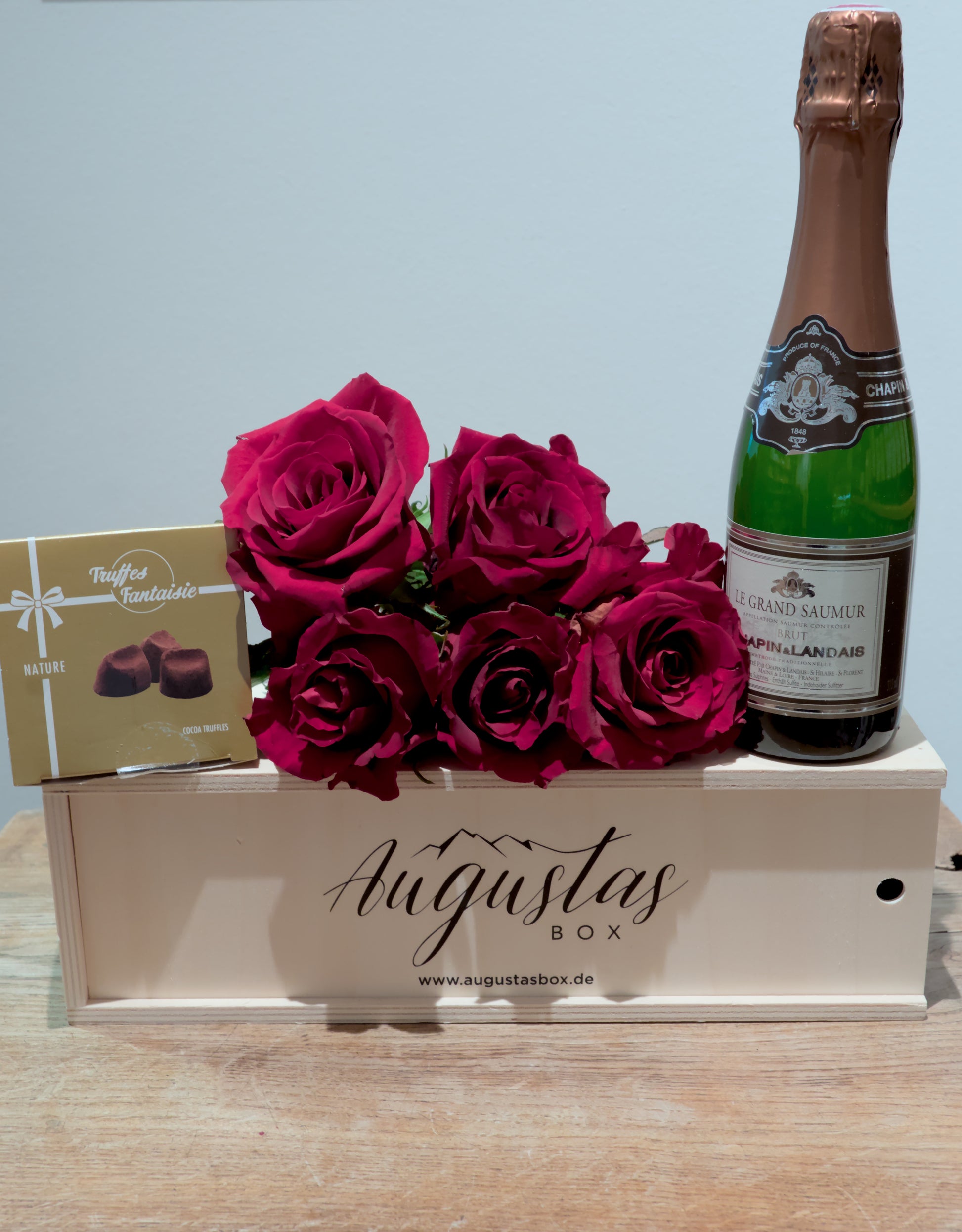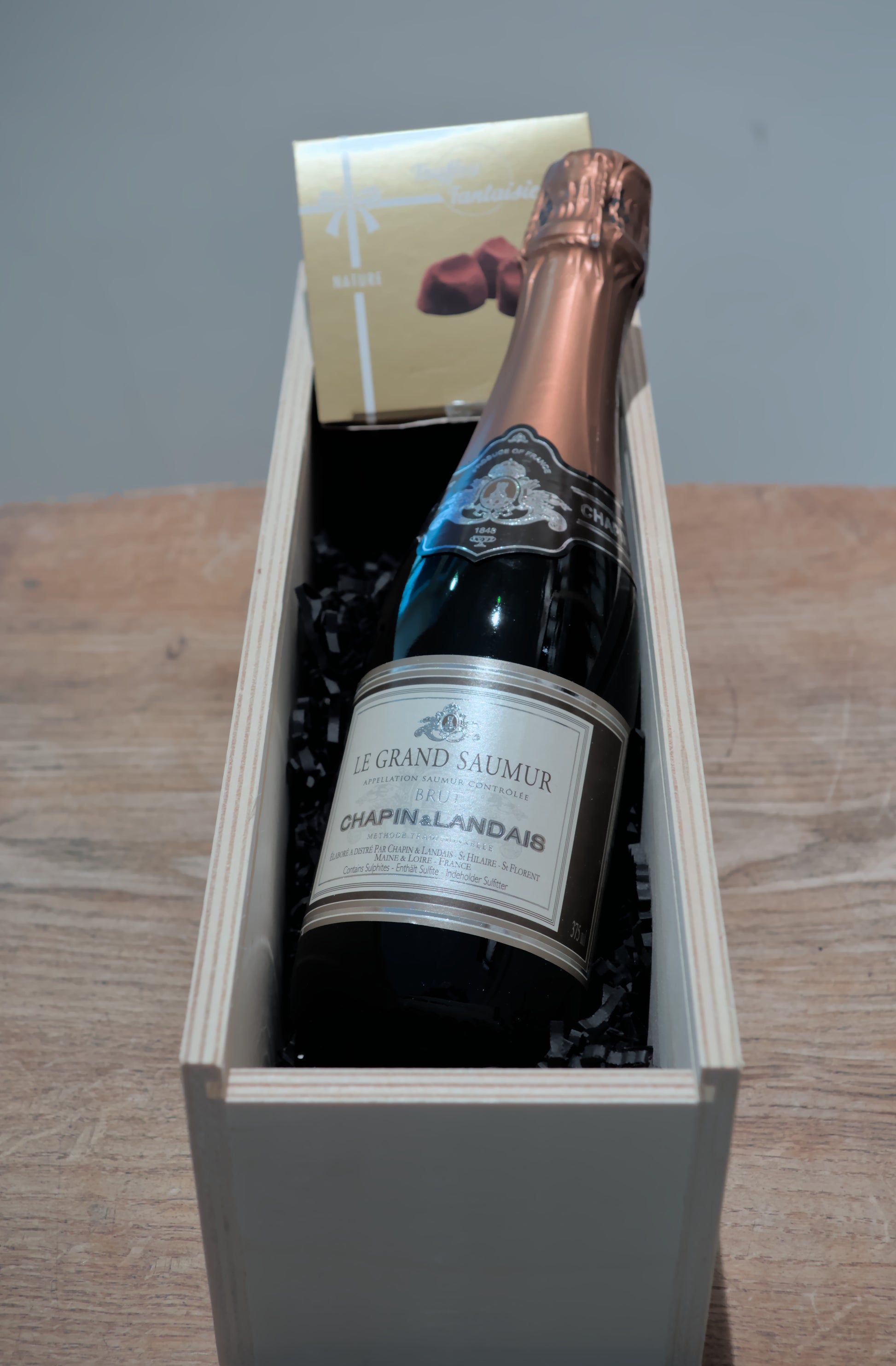 Eine halbe Flasche feinperligen Crémant, dazu eine Schachtel zarter Schokoladentrüffel (50 g). Schlicht, elegant und unwiderstehlich.
